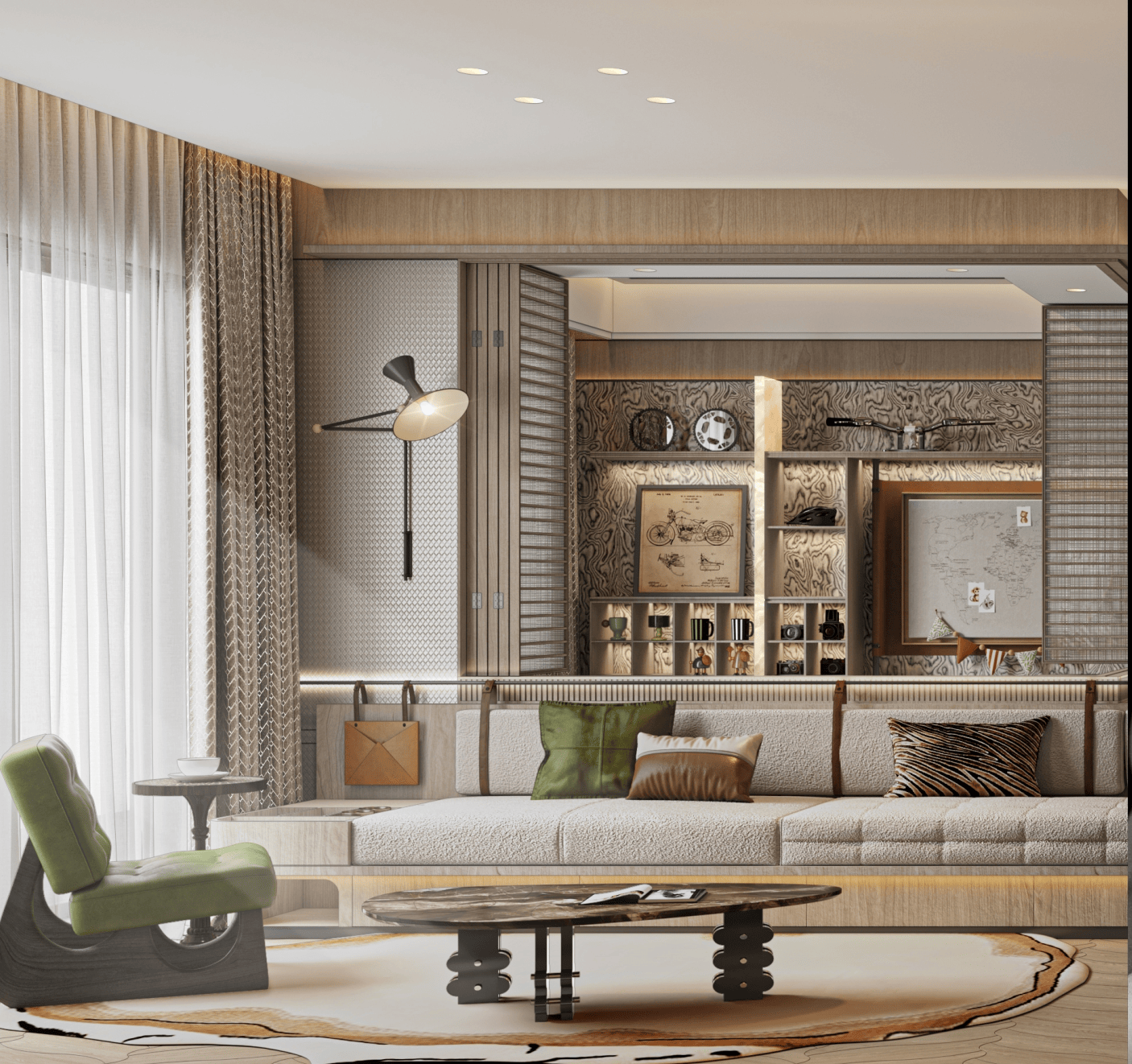 中隆置业创始⼈均来自一线年一二线城市人居产物建制及实操履历,空中天井错层设想引景入室,同时玻璃、金属线条构成空中天台,